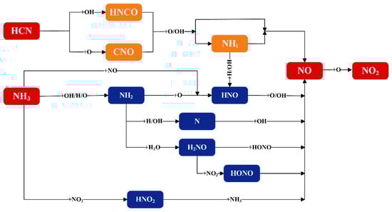 NH3 and HCN, as precursors of nitrogen oxides, may undergo secondary reactions during the CLP, leading to their oxidation and transformation into nitrogen oxides such as NO and NO2 [48,49,50,51,52]. As shown in Figure 4, volatile HCN can interact with water vapor and free radicals (H, OH, O) in other reactive gases to generate intermediates such as NCO and HNCO. These intermediates then react with free radicals to form NO or NHi. Similarly, NH3, another NOx precursor, can react with H· or OH· to form NH or NH2, which are then oxidized by O and OH· to generate NO [41,45,53]. Thus, the formation of NO is the result of a series of basic reactions between nitrogen oxide precursors and free radicals. In addition to free radical reactions, there are also reactions between NOx and NH3 [50,51,54]. Under the presence of oxygen free radicals, NO is easily oxidized into NO2, although the formation of NO2 is less than that of NO [45,55].