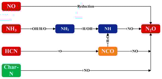 The formation pathway of N2O is depicted in Figure 5. HCN is one of the primary precursors of N2O. During the CLP initial stages of the reaction., HCN reacts with O· to form NCO, which further reacts with NO to generate N2O. NH3 can also react with free radicals, thereby indirectly producing N2O. NOx, particularly NO, can be reduced by the OC to N2 and N2O [51]. Additionally, the direct reaction of N· on the surface of char with NO is another pathway for the formation of N2O [45,56].