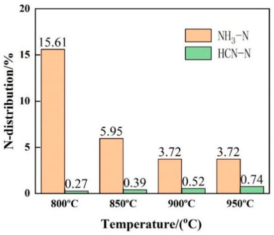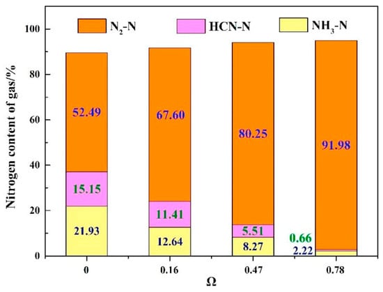 The addition of steam to the reaction atmosphere leads to the generation of a large number of H, O, and OH radicals, which can promote the hydrogenation and cracking of nitrogen compounds in tar-N and char-N. The HNCO produced by the cracking of amine-N can further hydrolyze to form NH2COOH, and N-containing heterocyclic compounds are activated and decomposed under the action of free radicals. These processes ultimately result in an increase in the production of NH3 and HCN [87,88,89]. Additionally, the enhancement of the reducing atmosphere aids in the reduction of nitrogen oxides, promoting the conversion of NOx to N2 [51,89].