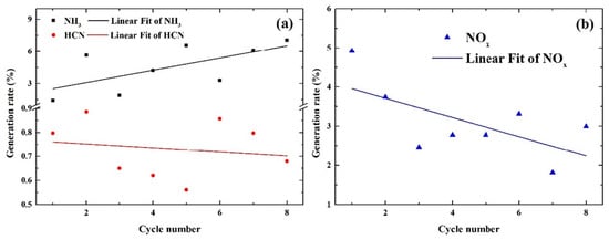 The generation rates of (a) NH3 and HCN and (b) NOx vs. the number of CLC cycles [69].