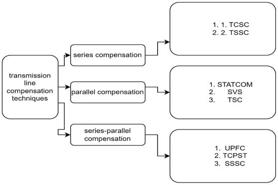 Static VAR compensator (SVC) is a first-generation FACTS device that can control voltage at the required bus thereby improving the voltage profile of the system. The primary task of an SVC is to maintain the voltage at a particular bus by means of reactive power compensation (obtained by varying the firing angle of the thyristors) [9]. SVCs have been used for high-performance steady-state and transient voltage control compared with classical shunt compensation. SVCs are also used to dampen power swings, improve transient stability, and reduce system losses by optimized reactive power control [51]. Thyristor-controlled series capacitor (TCSC) is one of the important members of FACTS family that is increasingly applied with long transmission lines by the utilities in modern power systems. It can have various roles in the operation and control of power systems, such as scheduling power flow; decreasing unsymmetrical components; reducing net loss; providing voltage support; limiting short-circuit currents; mitigating sub synchronous resonance (SSR); damping the power oscillation; and enhancing transient stability [52]. Among the available FACTS devices, the unified power flow controller (UPFC) is the most versatile one that can be used to improve steady-state stability, dynamic stability and transient stability [53]. The UPFC can independently control many parameters since it is the combination of static synchronous compensator (STATCOM) and SSSC. It has been reported in many papers that UPFC can improve stability of single machine infinite bus (SMIB) system and multimachine system [54,55]. Transmission line compensation is subdivided into three categories, which are shunt series compensation and combination of series parallel; this is shown in Figure 4. Furthermore, the technology used in each category is listed for each classification