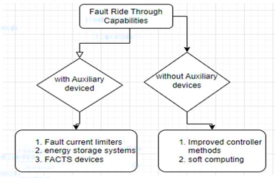 Also, the prompt response to disturbances by disconnecting photovoltaic (PV) and wind plants can have adverse effects on the stability of the system. Hence, it is imperative for photovoltaic (PV) and wind power plants to maintain grid connectivity in the event of faults for a specified duration, ensuring their fault ride-through (FRT) capabilities. The stipulation is primarily attributed to the contemporary grid code, which may vary across countries based on various criteria. The requirements specified by the South African grid code include voltage limits of ±1 per unit (pu), frequency limits of ±5%, and limits on current/voltage harmonic distortions, specifically a total harmonic distortion voltage (THDv) of 0.1% and a total harmonic distortion current (THDi) of 5% [64]. For the purpose of enhancing fault ride-through (FRT), a concise summary of various methodologies, as presented in the literature, is categorized in accordance with Figure 5. They are classified as per their configuration that requires auxiliary devices and those that do not require these devices [64].