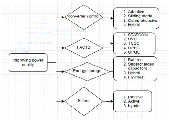 Power electronic converters play a crucial role as the central processing units of a renewable energy system and grid integrated systems. The presence of these components induces harmonic injection, leading to system destabilization in the entire system. The enhancement of power quality in renewable energy systems (RES) is achieved through the implementation of diverse techniques, such as the integration of advanced control systems and the utilization of various ancillary equipment [65]. These can be classified based into four categories which are use of Facts devices, using energy storage technologies, the use of filtering technologies and different design for converter control as shown in Figure 6. Furthermore, each category uses specific technologies to achieved an improved power quality for example under battery storage system there is use of batteries, supercharged capacitors etc.