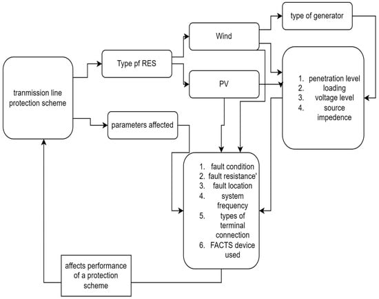 Integration of renewable energy affects the performance of conventional protection schemes. According to [107] the conventional relay protection employed for the collector line of a wind farm encounters issues pertaining to inadequate selectivity and diminished sensitivity. This arises due to the utilization of a solitary protection component on the bus-side of the collector line. The fluctuations in wind speed directly impact the variations in voltage, frequency, and power generation of wind farms. Hence, it is of utmost importance to implement an adaptive system for distance protection of the transmission lines that interconnect said farm with the power grid is essential [108]. The effectiveness of a distance relay may be notably influenced by several uncontrolled variables, including fault resistance, fault type, fault location, and noise. Furthermore, the integration of photovoltaic power plants into electrical grids results in unique fault current characteristics compared to conventional power systems with synchronous generators [109].