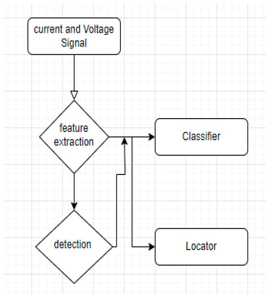 The process of fault classification presents several challenges due to various factors. The determination of both the fault type, such as line-to-ground or line-to-line, and the estimation of fault direction are of utmost importance. The task of fault localization and classification in a series compensated line is a crucial and challenging matter. Transmission line protection utilizes fault detection and pattern identification methodologies, employing intelligent techniques such as symbolic expert systems, neural networks, and fuzzy logic systems. The input signals for the classifier design under consideration are derived from the measurements of the three-phase voltage and current in the power system as illustrated in Figure 6, which illustrates the flowchart for the complete protection scheme. Firstly, feature extraction is performed to reduce signal processing without losing the original data. The extracted feature is further processed to detect, classify, and locate faults. The challenges associated with classification and fault localization exhibit comparable complexities. Within advanced signal processing methodologies, wavelet transform (WT) stands out as a widely utilized tool extensively employed in fault detection research. This method involves decomposing the signal into high- and low-frequency bands, referred to as approximate and detailed coefficients [34]. In [151], the authors introduced a novel fault location method for transmission lines, which combines wavelet packet decomposition (WPD) with support vector regression (SVR). This approach caters to different fault types, locations, fault resistances, and fault inception angles within a series compensated scheme. It utilizes regression to associate WPD sub-band energies of various fault types with fault locations on the modeled transmission line. Furthermore, it is observed that the inclusion of a low-pass filter improves the accuracy of the method. Figure 9 shows the process flow when applying fault detection, classification and location algorithm for protection relays. Voltage and current signals are collected using different methods at the relay bus during fault conditions. Afterward, feature extraction is performed; feature extraction is a method for reducing the dimensions of data. It produces a more compact and informative set of attributes. The number of features can be specified by the user or determined by the algorithm. Fault detection and diagnosis typically involves classifying faults after extracting features, a process that includes selecting the classification algorithm, while location is the information given as a response of the protection scheme in regards of the fault location.