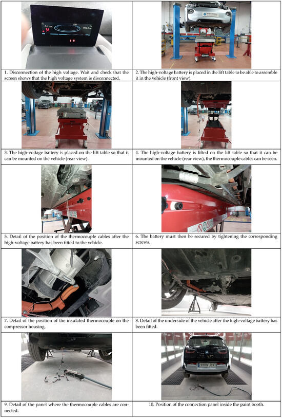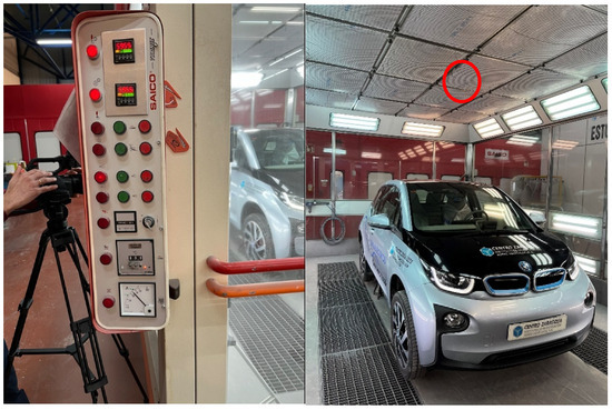 The experimental principles focus on evaluating the thermal impact on the traction battery of a BMW i3 during the drying phase in a paint booth. By leveraging a combination of direct temperature measurements using T-type thermocouples and diagnostic tools connected to the vehicle’s OBD, this study aims to monitor and record the battery’s temperature at different states of charge (SoC). The paint booth conditions are carefully controlled, with the temperature set to 60 °C for 60 min, followed by a ventilation phase, to replicate typical automotive manufacturing and repair processes.