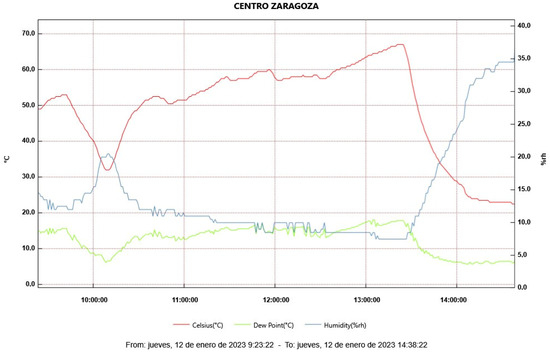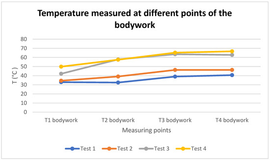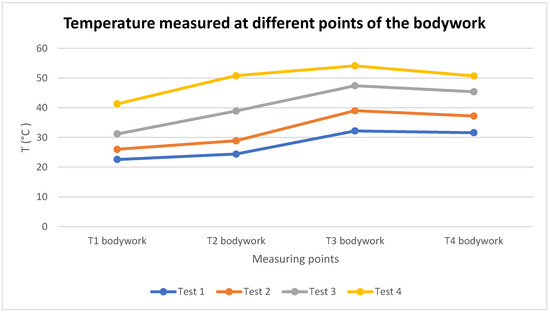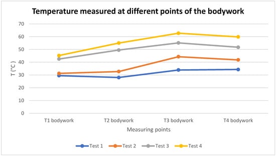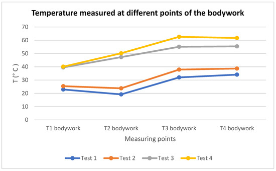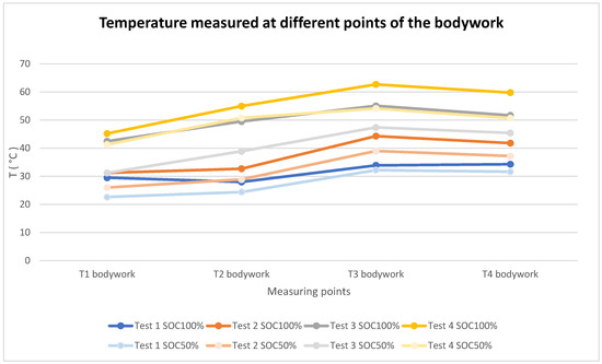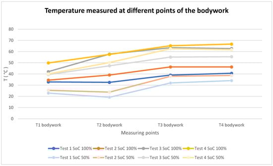 Graph of the temperature measured at different points of the bodywork with a thermal imaging camera in the four tests carried out with the battery at 100% SoC.