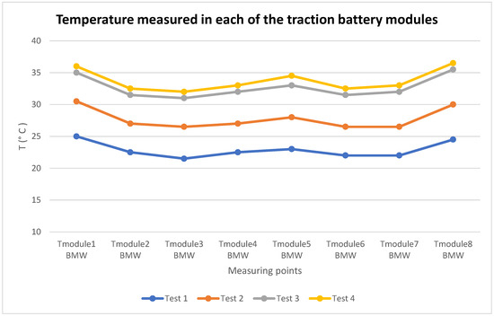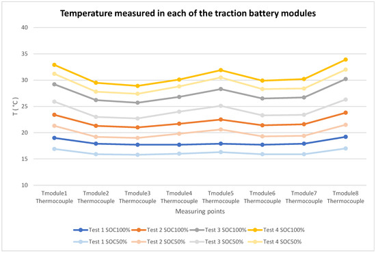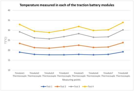 Graph of the temperature in each of the modules of the traction battery obtained with temperature-measuring equipment (thermocouples) in the four tests conducted with the battery at 100% SoC.