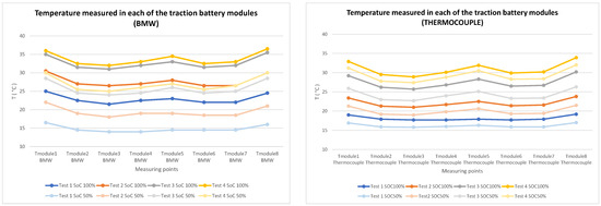 - In the case of the measurement conducted using BMW diagnostic equipment, the observed temperature differences for each battery state of charge during the tests were significantly larger compared to the temperature differences measured using thermocouples placed on each of the traction battery modules.