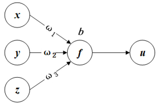 Deep learning employs backpropagation algorithms to identify intricate structures within expansive datasets [31]. Deep learning is a machine learning method based on neural networks that learns input data layer by layer through multi-layer neural networks, thereby enabling the modelling of complex nonlinear relationships. The basic structure of the neural network is shown in Figure 1. The relationship between input neurons x, y, z and output neuron is described by weight , bias , and activation function , as shown: