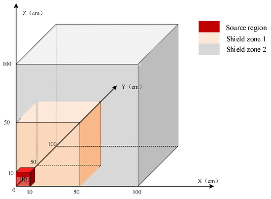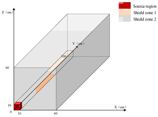 Given the inherent interdependence of neutron flux on source strength and cross-sections parameters during the shielding transport calculation process, the dataset comprises the average source strength of the source region, total cross-sections, and scattering cross-sections information for each material. Meanwhile, the dataset encapsulates the neutron flux distribution at specific positions within the geometric model. The neutron flux distribution was obtained using the three-dimensional particle transport calculation code ARES [34], which employs the discrete ordinates method for transport simulation calculations. The Kobayashi benchmark [35] was developed by OECD/NEA. It is typically employed to assess the computing power of shielded transport procedures. The Kobayashi benchmark is comprised of three independent questions, each of which is divided into two categories: total absorption and semi-scattering, of which the anisotropy of models 2 and 3 increases gradually with the channel due to the existence of straight and zigzagging channels. The isolated source region of Kobayashi-1 (Figure 2) is surrounded by a large cube cavity with a side length of 100 cm. Basic Dataset-1 is constructed based on the Kobayashi-1 geometric model to simulate the problem of constant geometry and changing material sections; the isolated source region is wrapped by two different shielding layers. Kobayashi-2 (Figure 3) adds straight channels and enhanced anisotropy, which increases the difficulty of the shielding calculation. Basic Dataset-2 is constructed based on the Kobayashi-2 geometric model to simulate the problem of constant geometry and changing material cross-sections.