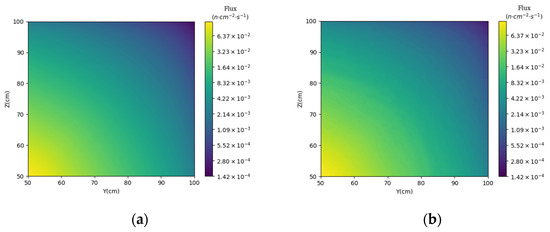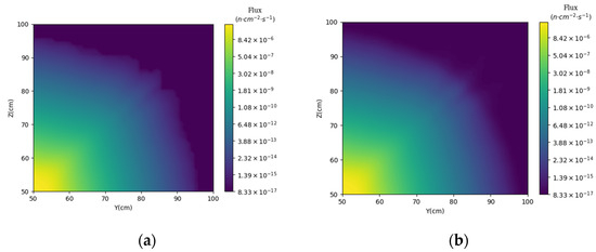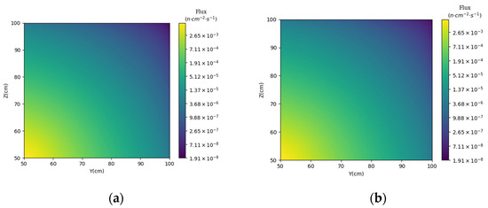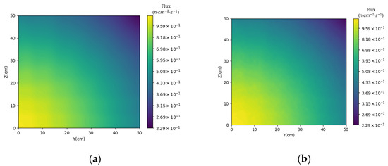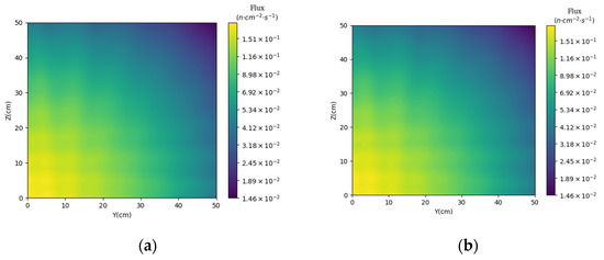 Comparison of neutron flux for validation use case 2: (a) SN calculation, (b) Surrogate Model-2 prediction.