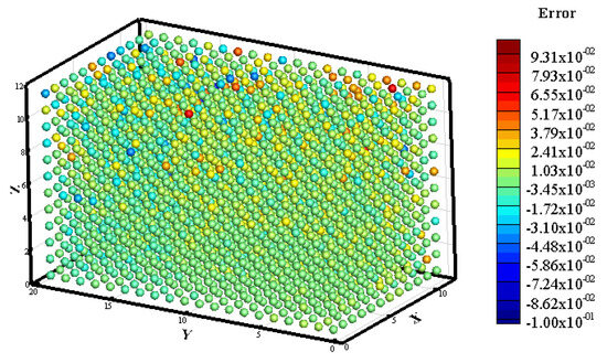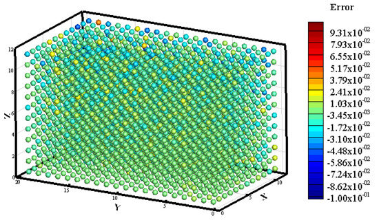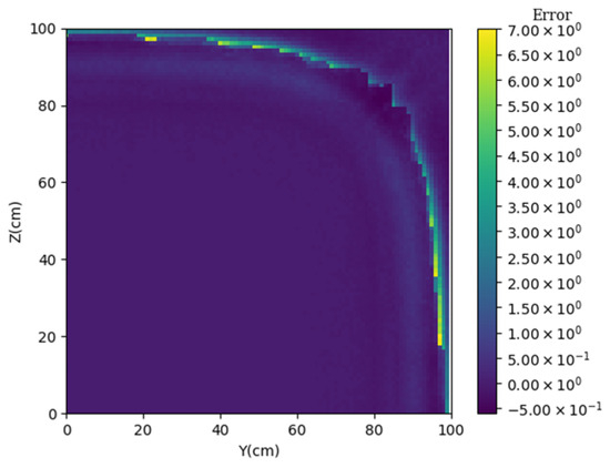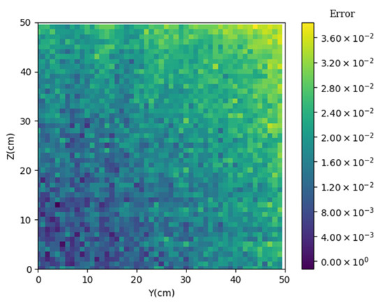 Validation use case 3: The error between SN calculation and Surrogate Model-3 prediction on 2500 grids at x = 55.5 cm, 50 cm < y < 100 cm, and 50 cm < z < 100 cm.