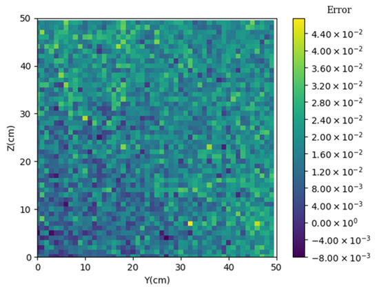 Validation use case 1: The error between SN calculation and Surrogate Model-3 prediction on 2500 grids at x = 55.5 cm, 50 cm < y < 100 cm, and 50 cm < z < 100 cm.