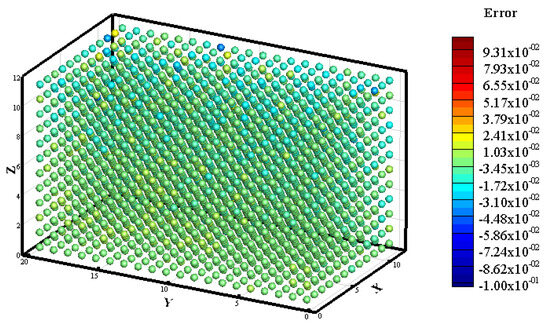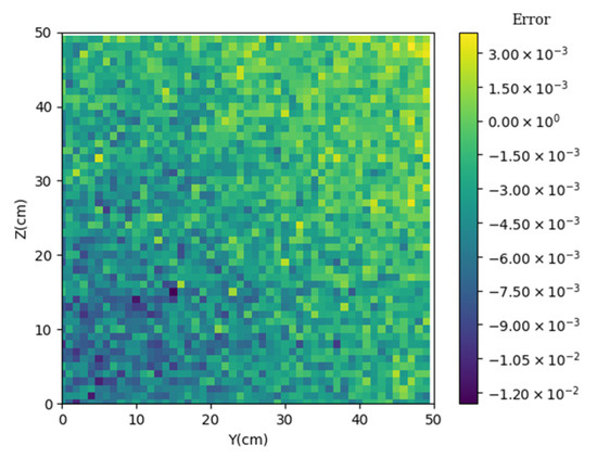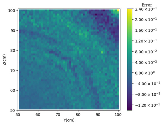 Validation use case 2: The error between SN calculation and Surrogate Model-3 prediction on 2500 grids at x = 55.5 cm, 50 cm < y < 100 cm, and 50 cm < z < 100 cm.