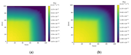 Comparison of neutron flux for validation use case 6: (a) SN calculation, (b) Surrogate Model-4 prediction.