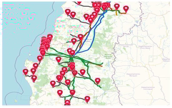 The red points represent the geographical location of some buses in the Electric National System of Chile. The blue, green, and black lines represent transmission lines in different voltage levels.