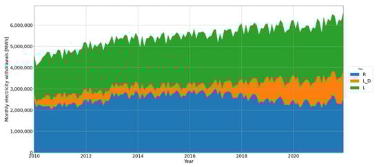 Electric demand organized by type of clients, where “R” is regulated clients, L is “non-regulated clients”, and “L_D” represents non-regulated clients connected to the distribution power system.