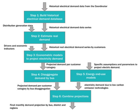 The methodology developed was based on different econometric models and end-use models to represent the massification of low-carbon emission technologies. The steps of the proposed methodology are shown in Figure 3, and their inputs and main process are described as follows.