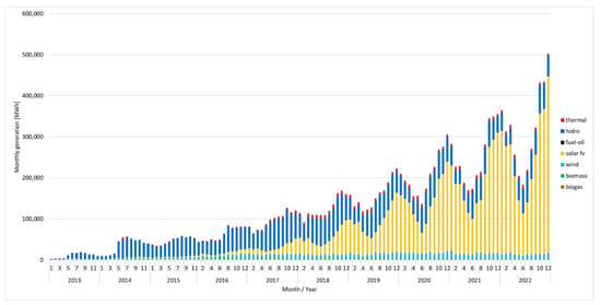 The historical generation of SMDG projects is obtained from the Calculation Backgrounds for Economic Transfers, published by the Coordinator. From the energy withdrawal information, power plants with energy injections (or negative consumptions) are identified, along with their respective year, month, and connection point. Then, to integrate historical generation into the demand projection model, the power plants were assigned to the existing substations or nodes in the electric demand data. Figure 4 and Figure 5 show the historical generation of SMGD power plants by technology and by region, respectively.