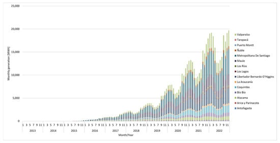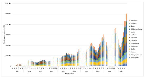 Once the generated energy from each project is obtained, it is grouped by district. Then, the energy is distributed among the feeders located in the district in proportion to the capacity of each feeder. If a district does not have feeders, the feeders from the nearest district are assigned. Figure 6 shows the estimated historical generation of net billing projects, by region.
