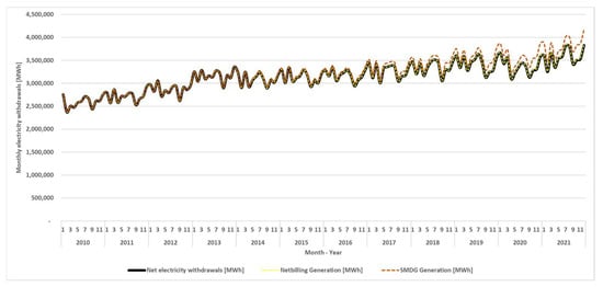 Figure 7 shows the effect on demand of distributed generation contribution. The black line represents the reported withdrawal data by customers. The yellow line represents the electric demand plus generation from net billing projects. Finally, the red line represents the estimated real demand considering the contribution of generation from net billing projects and the SMDG described above.