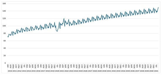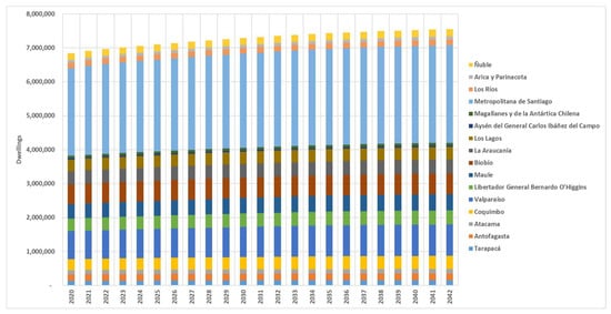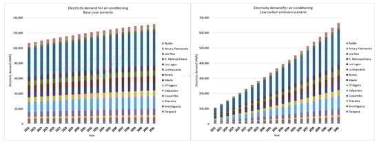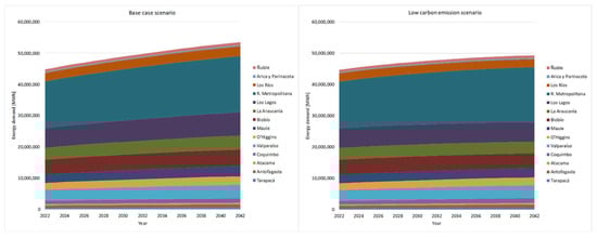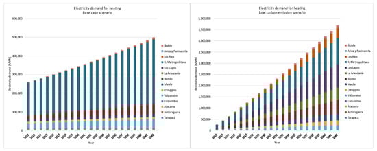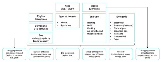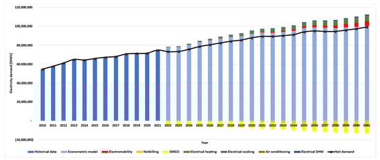 Currently, in Chile, there is an energy policy promoting the development of low-carbon emission technologies to achieve carbon neutrality by 2050 []. Due to the econometric models described above, it may not adequately capture the effect of these technologies; projections will need to consider the inclusion of new energy requirements that could affect demand projections. Examples include the electrification of residential consumption (e.g., the increased use of electric heating, air conditioning, etc.), public and private electromobility, energy efficiency, hydrogen production, etc. These electric demand projections will be performed using an end-use model, and then these projections will be added to the projections obtained with the econometric models. Figure 8 shows the general methodology.