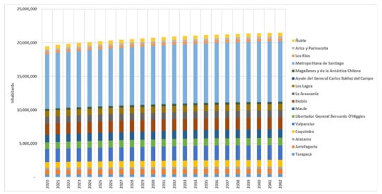 In Chile, there are some previous works related to electric demand projection. The Coordinator periodically forecasts electrical demand in the country to make use of the projection for several long-term studies such as the power transmission planning proposal of the Chilean Electrical Grid, among others. The last electrical demand projection model was developed in 2018 []. That model is based on an econometric model that seeks to capture the relationship between electricity demand and its main explanatory variables, and to forecast electricity consumption consistent with the expected patterns for these variables. The electrical demand is disaggregated into demand from non-regulated and regulated customers. Non-regulated customers are disaggregated into the copper mining industry and all other industries. Unlike the work that is shown in this paper (see next methodology section), the projection carried out in 2018 did not disaggregate non-regulated clients into more economic sectors, other than the copper industry, and did not consider new technologies and changes in customers’ behaviors such as electromobility, electrification in the residential sector, distributed generation, etc. with the detail as carried out in this work. Also, several improvements were introduced to the software that computes electrical demand projections and the software that shows the projections at the bus level with accurate georeferentiation.