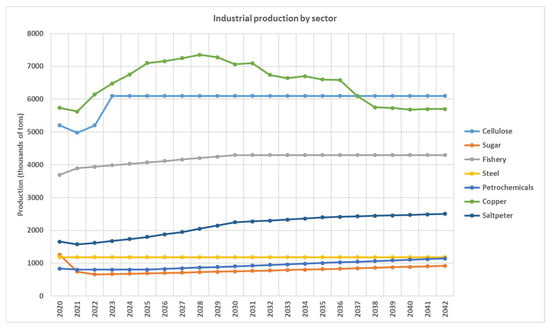 For every sector, historical information of industrial production was obtained from different information sources. Afterwards, the electricity demand projection was distributed by bus according to the observed historical participation of each industrial sector. The developed models for each economic sector are shown in Table A4, Table A5, Table A6, Table A7, Table A8, Table A9, Table A10 and Table A11 in Appendix A. Model number 1 was chosen for each economic sector, but the steel industry and the commercial were chosen for model 2. Additional dummy variables were added in some econometric models. Lagged versions of these variables were also tested. The models shown in Appendix A have between 119 and 144 observations; depending on the industry, the amount of available historical data, and if lagged variables were used.