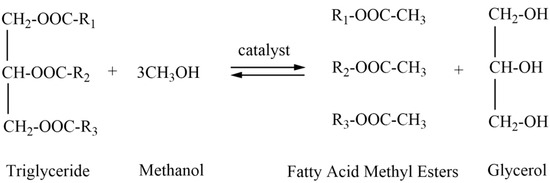 Biodiesel, an alternative diesel fuel, is produced from biomass resources such as vegetable oil, animal oil, or waste oil through transesterification. Currently, four methods are employed for biodiesel preparation: microemulsion, dilution (blending), pyrolysis (thermal cracking), and transesterification. Among these, transesterification is the most common and widely used method due to its high conversion rate and ease of industrialization [14]. This process involves mixing triglycerides, the primary component of raw oil, with short-chain alcohols (methanol or ethanol). Under the action of a catalyst (alkaline, acidic, or enzymatic), an acyl transfer occurs, resulting in the formation of fatty acid methyl esters (biodiesel) and glycerol as a by-product, as shown in Figure 1.