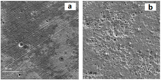Multiple sets of experimental data indicate that carbon steel will exhibit varying degrees of corrosion after being exposed to different types of biodiesel for a period of time [101,102,103]. Figure 2 shows a comparison between carbon steel and stainless steel corroded by biodiesel. The surface of carbon steel will exhibit relatively uniform corrosion, and pores or depressions can be observed [104]. As corrosion continues, Fe2O3 and Fe3O4 compounds will appear on the metal surface. The severity of corrosion may be related to the manganese content in carbon steel. Research has shown that manganese has a negative impact on the oxidation stability of biodiesel [102]. The higher the manganese content in carbon steel, the easier it is for biodiesel exposed to it to oxidize and degrade.