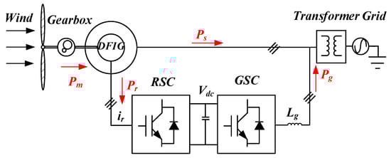 The capacity of the back-to-back power converter is relatively small compared to the DFIG, leading to its cost-effectiveness from the viewpoint of economics. The rotor in DFIG is linked to the power grid using the RSC and the GSC, while the stator side is directly connected to the grid. The function of the GSC is to keep the DC bus voltage fixed and meet the reactive power demand according to the grid codes, while the RSC can produce active power to the power grid through following maximum power point tracking (MPPT) and providing the exciting current for DFIG [].