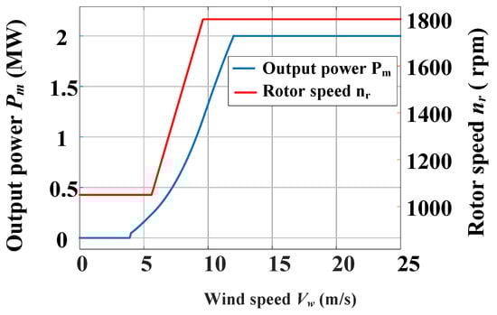 This case study applies a 2 MW wind turbine to investigate the thermal performance of converters and power semiconductors. The relationship between DFIG rotor speed and output power concerning the wind speed is shown in Figure 2. As the wind speed increases from the cut-in wind speed of 4 m/s to the rated wind speed of 12 m/s, the output power also increases to the rated value. The detailed parameters of the wind turbine system are listed in Table 1.