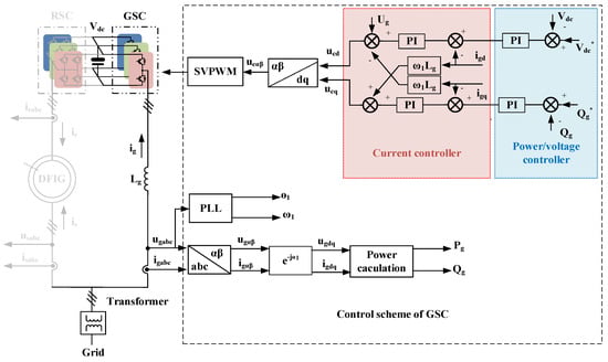 This paper takes the GSC and RSC as an example for analysis, where the grid voltage-oriented control approach is used with a dq reference rotating frame. As shown in Figure 3, the GSC control strategy includes two cascaded loops. The inner loop mainly focuses on the grid current ig, and the outer loop takes care of the reactive power Qg and dc-link voltage Udc. The d-axis grid current is used to keep the dc-link voltage constant, and the q-axis grid current regulates the reactive power [,].