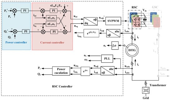 The objective of RSC is to regulate the stator active and reactive power injected into the power grid. As shown in Figure 4, the RSC control strategy also includes two cascaded control loops. The inner current loop ir regulates the d-axis and q-axis rotor current, and the outer loop decouples the reactive and active power of the stator side. Aligning the d-axis of the reference frame along the stator voltage vector position, the relationship between the rotor voltage and rotor current can be found:
