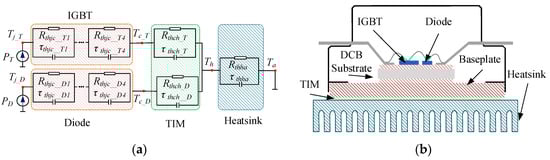 The thermal network of the power module is shown in Figure 5a. In general, in order to facilitate calculation, the junction-to-case RC network will be converted into a fourth-order Foster model (from junction to case) []. Combined with the thermal network mathematical model, as shown in Figure 5b, the actual physical material layers from top to bottom are the silicon chip, solder, direct copper bonding (DCB) substrate, the baseplate, thermal interface material (TIM), and the heatsink.