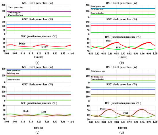 As the performance of both the GSC and RSC are different, the comparison between the sub-synchronous state and super-synchronous state results are shown in Figure 6a–d, respectively. During sub-synchronous mode, the power loss of the diode in the GSC is higher, and diode conduction losses and switching losses are higher in this state; moreover, the junction temperature fluctuations are higher than the GSC. Figure 6c,d show the output of the GSC and RSC in the super-synchronous state, respectively. In the super-synchronous mode, the GSC IGBT power consumption is higher, but the GSC IGBT junction temperature fluctuates less than the diode. Compared with the sub-synchronous mode and super-synchronous mode, the latter has higher thermal stress.