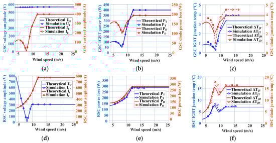 Under different wind speed conditions, the theoretical and the PLECS simulation comparison of DFIG GSC and RSC are shown in Figure 7. To evaluate all the loading conditions of the DFIG power converter, the wind speed from the cut-in value (4 m/s) to the rated value (12 m/s) are taken into account. Figure 7a–c and Figure 7d–f are the output voltage, current, power consumption, and junction temperature fluctuation of the GSC and RSC, respectively.