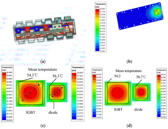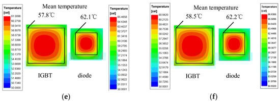 As the power loss of the IGBT module is applied to the chip according to Table 4, the steady-state and transient-state thermal simulations monitor average chip surface temperature and fluctuations. Other boundary conditions are as follows: (1) The heat dissipation method is fin temperature heatsink cooling; both the heatsink temperature and ambient temperature are 50 °C. (2) The module size data come from the Danfoss company (Flensburg, Germany). It should be noted that, in order to achieve a small module geometry, the IGBT chips and diode chips are placed close to each other, and the chips are thermally coupled; this is due to the single-chip testing used in this paper following industrial testing practices. Therefore, only 1/6 of the original power consumption is required during power loss setup.