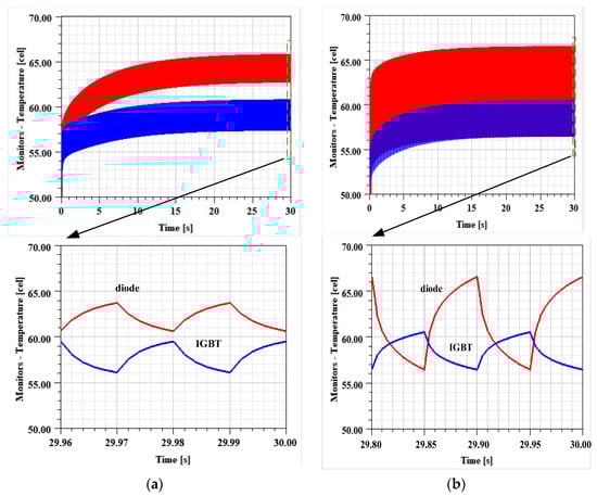 DFIG 2 MW wind turbine converter P3 power module Ansys simulation results during transient states: (a) GSC transient temperature swing in super-synchronous state; (b) RSC transient temperature swing in super-synchronous state.