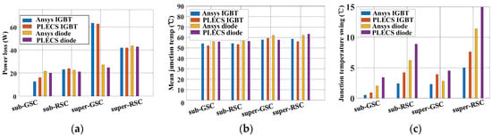 Ansys and PLECS simulation comparison of GSC and RSC power devices under different working conditions. (a) Power loss. (b) Junction temperature. (c) Junction temperature swing.
