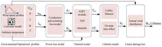 The thermal stress of the power device changes with the wind speed; the lifetime can be evaluated based on the annual mission profile. The lifetime from power cycling to failure is established based on the Coffin–Manson lifetime model. Finally, the device’s working status is related to the annual wind speed distribution, and the B10 lifetime of the device can be derived. The B10 lifetime formula of IGBT is as follows: