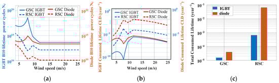According to the above formula, the relationship between the B10 power cycling lifetime and the corresponding wind speed can be found, as shown in Figure 12a. During the sub-synchronous range, the amount of power cycles to failure of the GSC is higher than that of the RSC, and the amount of power cycles to failure of the diode is lower than the IGBT. During the super-synchronous condition, GSC power devices have a longer lifetime due to smaller junction temperature fluctuations.