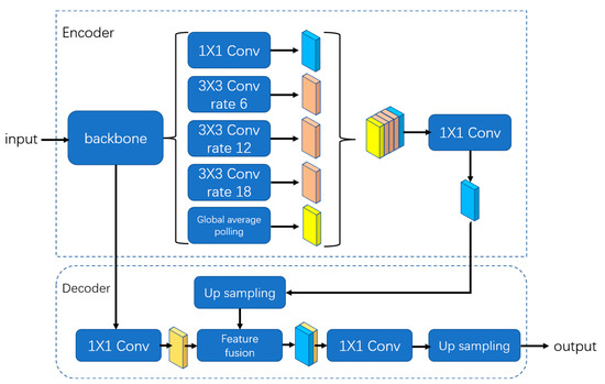 The DeepLabv3+ is an improvement on DeeplabV3. The network structure is shown in the Figure 1 with the addition of spatial pyramid pooling (SPP) layers and atrous spatial pyramid pooling layers, as well as more pooling layers to improve the accuracy of the model [19]. It uses the improved Xception model, which is a kind of residual network based on the architecture, and it adds a depth-separable convolutional layer in order to improve the efficiency of the model. It can effectively identify objects in an image and divide them into different categories. Its network structure is shown in Figure 1, which is divided into two parts: coding layer and decoding layer. In the coding layer, parallel atrous convolution is used to extract the features extracted from the backbone extraction network, and then the full convolutional layer is used to compress the features. In the decoding layer, the number of channels is adjusted for shallow features in the backbone network using full convolution, which is then stacked with the results after sampling on the effective features after atrous convolution. Then, the final effective feature layer is obtained using the depth-separable convolutional layer, and the number of channels is adjusted to be consistent with the number of segmentation categories by using the full convolutional layer. Finally, the width and height of the feature map are consistent with the input size of the original image via the above sampling.