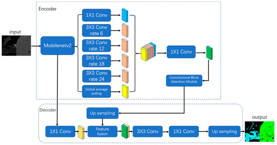 In this paper, we propose an improved DeepLabv3+ network, as shown in Figure 2. In the encoder part, first, the lightweight MobileNetV2 is used as the backbone network; then, an atrous convolution layer with a dilation rate of 24 is added to the ASPP feature fusion module; next, an attention mechanism module is introduced; finally, in the decoder part, a corrective convolution module is added.