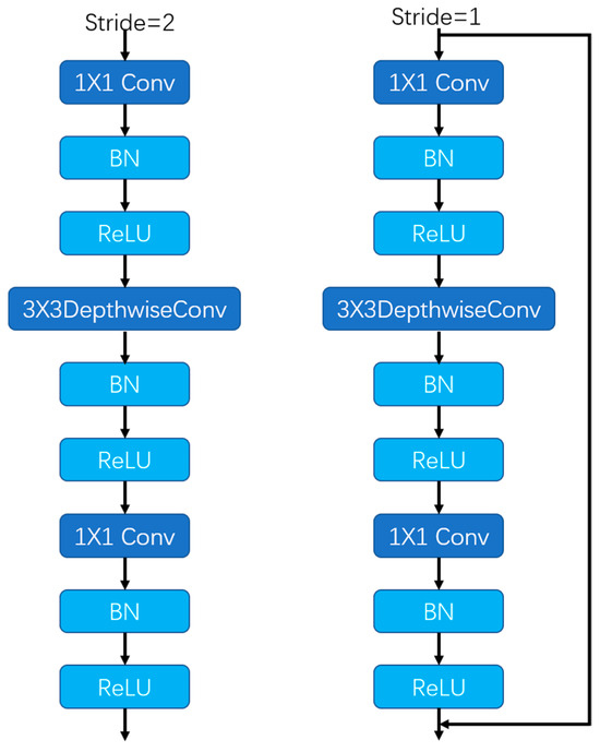 MobileNetV2 is a lightweight deep neural network designed for computer vision tasks such as image classification, object detection, and semantic segmentation. It improves upon MobileNetV1 by using depthwise separable convolutions, reducing the number of parameters by 50%, and providing higher accuracy with lower computational complexity. As shown in Figure 3, it employs an inverted residual structure, which is narrow at the ends and wide in the middle, outputting low-dimensional features. By using linear activation functions, it avoids feature loss.