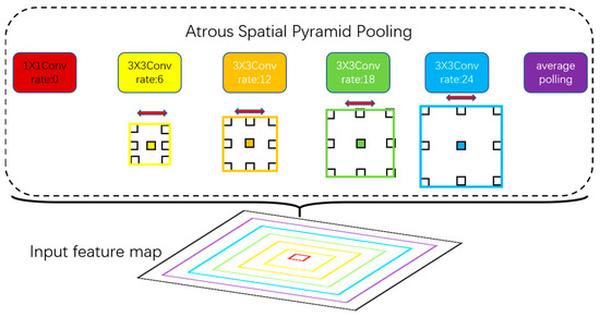 ASPP, also known as the spatial atrous convolution pooling pyramid [21], is illustrated in Figure 4. It utilizes atrous convolution layers with different dilation rates to capture multi-scale image features and integrate them. In the DeepLabv3+ network, the ASPP employs dilation rates of 6, 12, and 18. The larger the dilation rate, the larger the receptive field. In this paper, an additional atrous convolution layer with a dilation rate of 24 is introduced to the existing ASPP structure to obtain an even larger receptive field. This allows for the extraction of more feature information and increases detection accuracy.