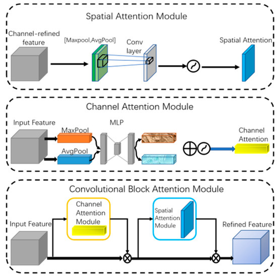 CBAM is an attention mechanism based on convolutional neural networks, which automatically learns important features of input images and combines them to enhance model performance [25]. As shown in Figure 5, it consists of two sub-modules: the channel attention submodule and the spatial attention submodule. In the channel attention module, input features are separately processed through max-pooling and average-pooling, then fed into a shared multi-layer perceptron (MLP), and finally aggregated and passed through an activation function to obtain channel attention features. In the spatial attention module, input features are processed through channel-wise global max-pooling and global average-pooling then concatenated and convolved to reduce to a single channel, followed by an activation function to obtain spatial attention features [26].