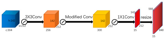 In this study, the proposed coal vitrinite identification task covers a total of 15 categories, including 14 types of coal vitrinite and background impurities. As shown in the Figure 6, at the network output, shallow features from MobileNetV2+ are fused with the output features of the ASPP module to generate a feature map with 304 channels. This feature map then undergoes a 3 × 3 convolution to reduce the channel number to 256. Subsequently, in the decoder section, a corrective convolution module is added, and the corrective convolution adjusts the number of channels to 300. Finally, a fully convolutional layer reduces the number of channels to 15, with each set of 20 channels corresponding to one category. The output is then resized to the original input image dimensions.