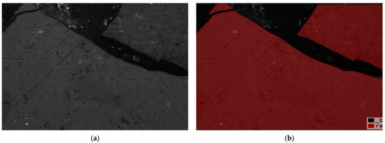 A total of 5600 images were labeled using the Labelme annotation software (4.5.13). In Figure 9, Figure 9a is the image after preprocessing and Figure 9b is the labeled image. There are 14 types of coal–rock vitrinite, each represented by a different color as detailed in Table 1. Different types of coal–rock vitrinite are denoted by code words, and when such vitrinite are identified, they are displayed in their corresponding colors.